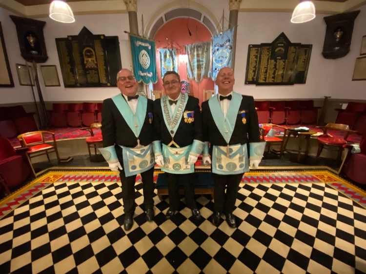Pictured here are WM Selwyn Williams, Bro. Stuart Johnson and W.Bro Derek Sawtell